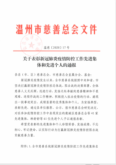 慈心播爱种,善意满人间!在新冠肺炎疫情防控工作中涌现出众多大爱无疆,勇气担当的好人好事,令人敬佩感动。温州厨师义工队更是首当其冲,他们义无反顾的先进事迹,无私奉献的慈善精神,在受表彰的全市慈善系统新冠肺炎疫情防控工作先进集体中名列榜首!