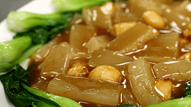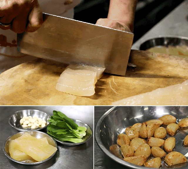 食材说来简单,不过三样,但却也讲究。鱼皮选用金钱鲨鱼皮,肉净、质厚,略带透明状,烹制前需纯手工古法涨发。蒜则选用紫皮大蒜,蒜瓣均匀,口感更辛辣浓郁。