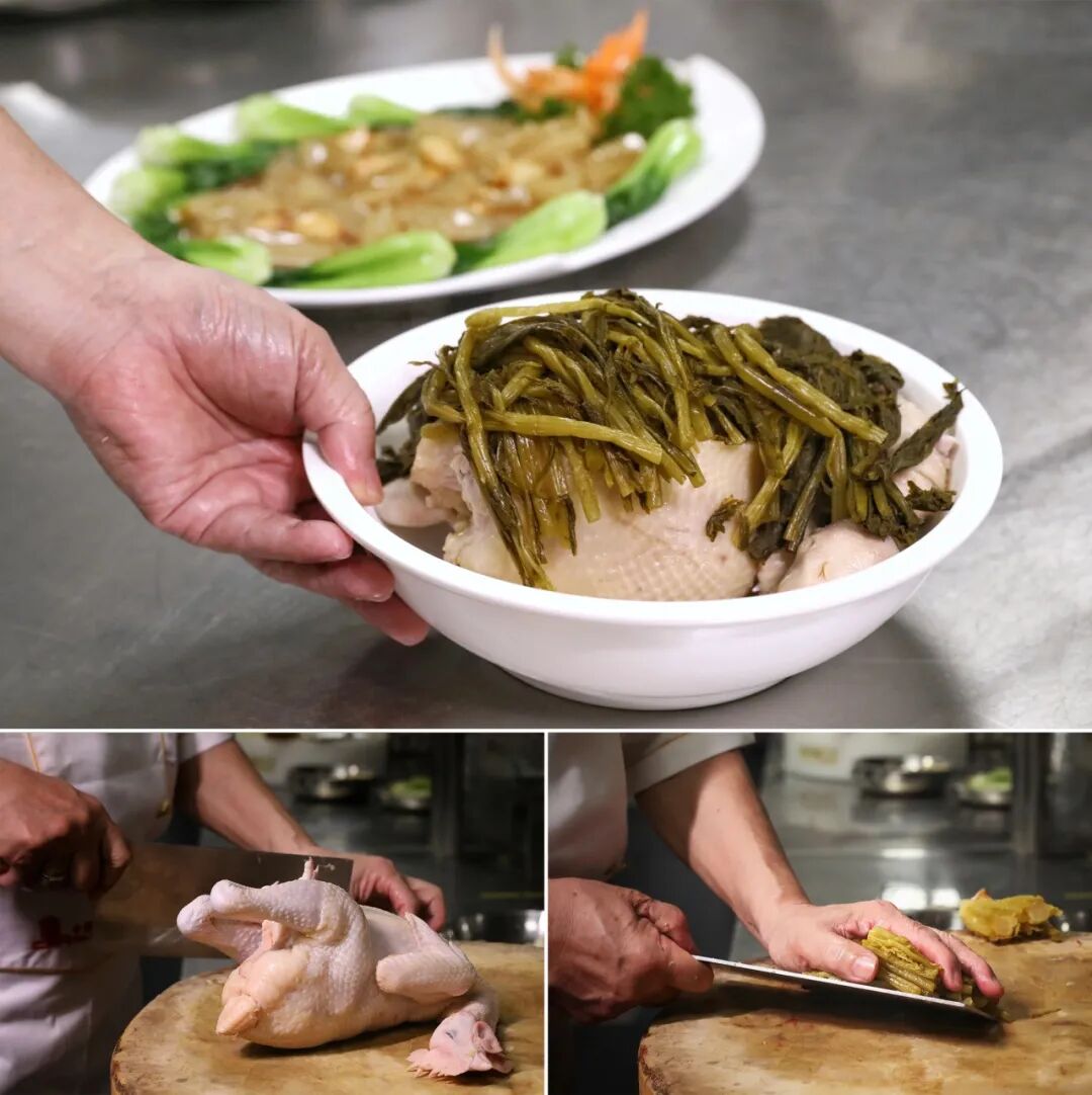 鸡炖熟后,将咸菜梗入油爆炒后,倒入鸡汤一起入味,最后淋至全鸡之上,一道咸菜鸡就完成了。