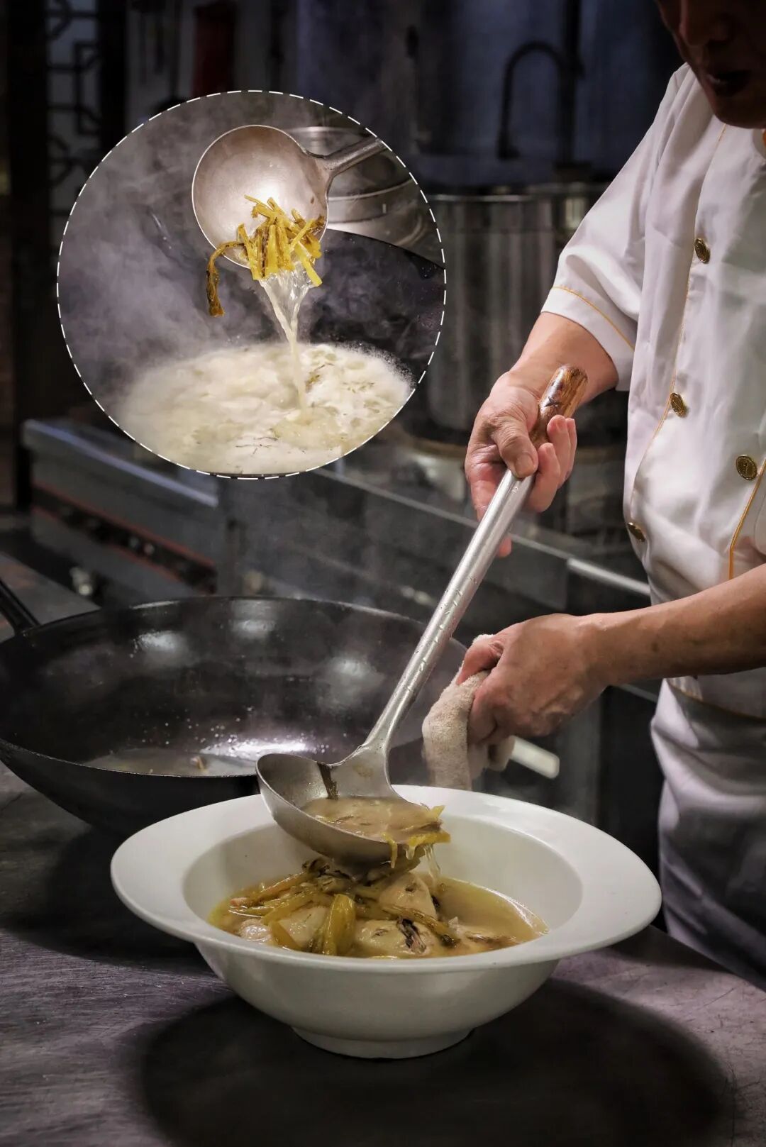 选用本地鸡全鸡,肉质才足够软嫩鲜美;咸菜也需是雪里红,才够咸香爽口。