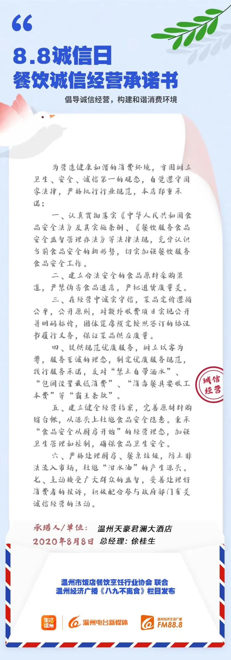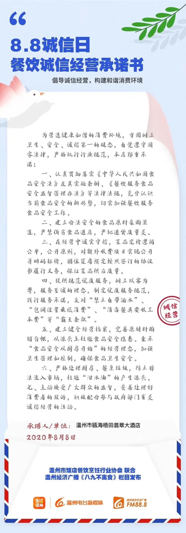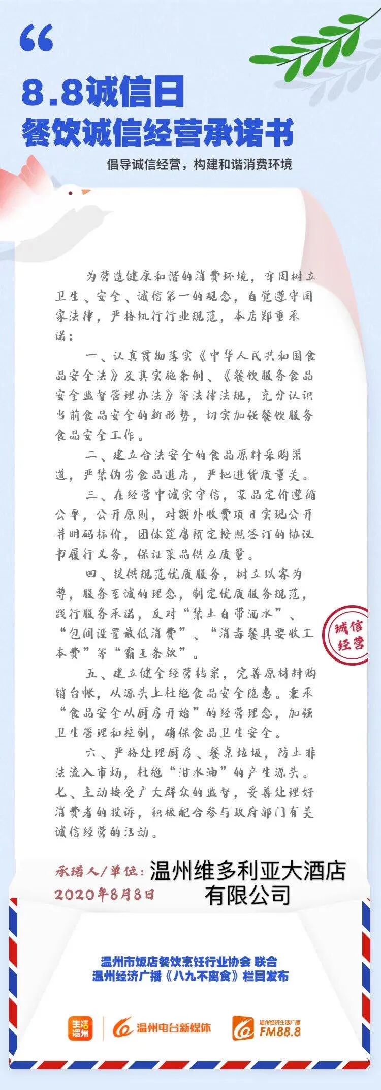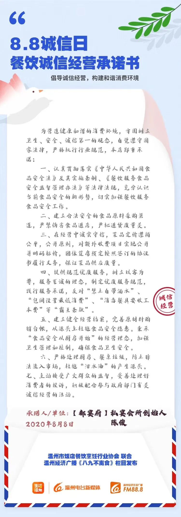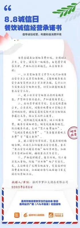 "8.8诚信日“,温州市饭店餐饮烹饪行业协会 温州市经济广播电台FM88.8《八九不离食》栏目联合全市餐饮人诚信经营承诺联盟云发布,第一站,直播倡议承诺书,分享诚信经营诚意服务故事和事例!