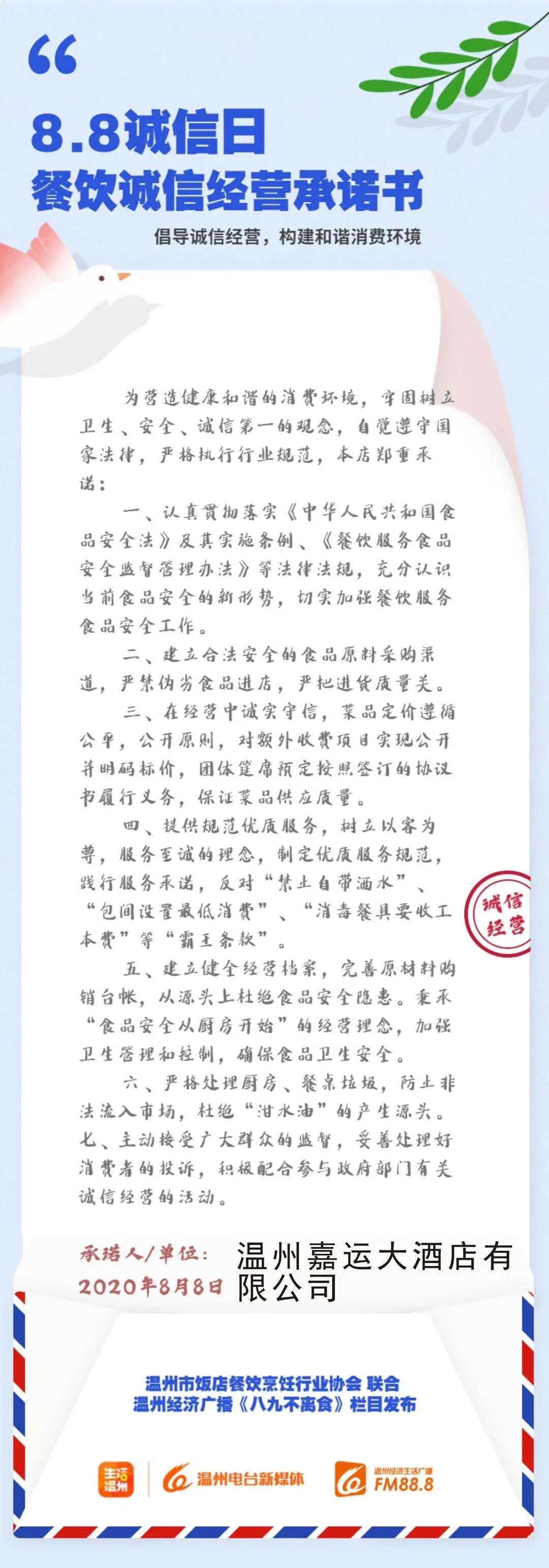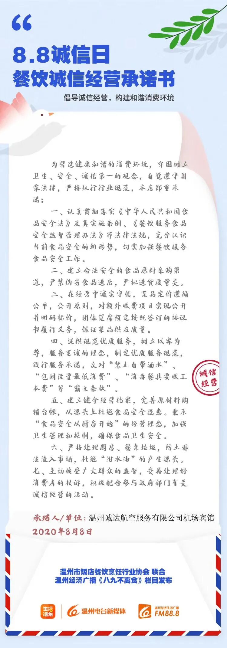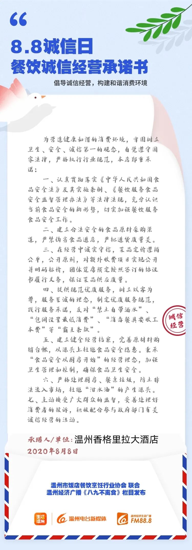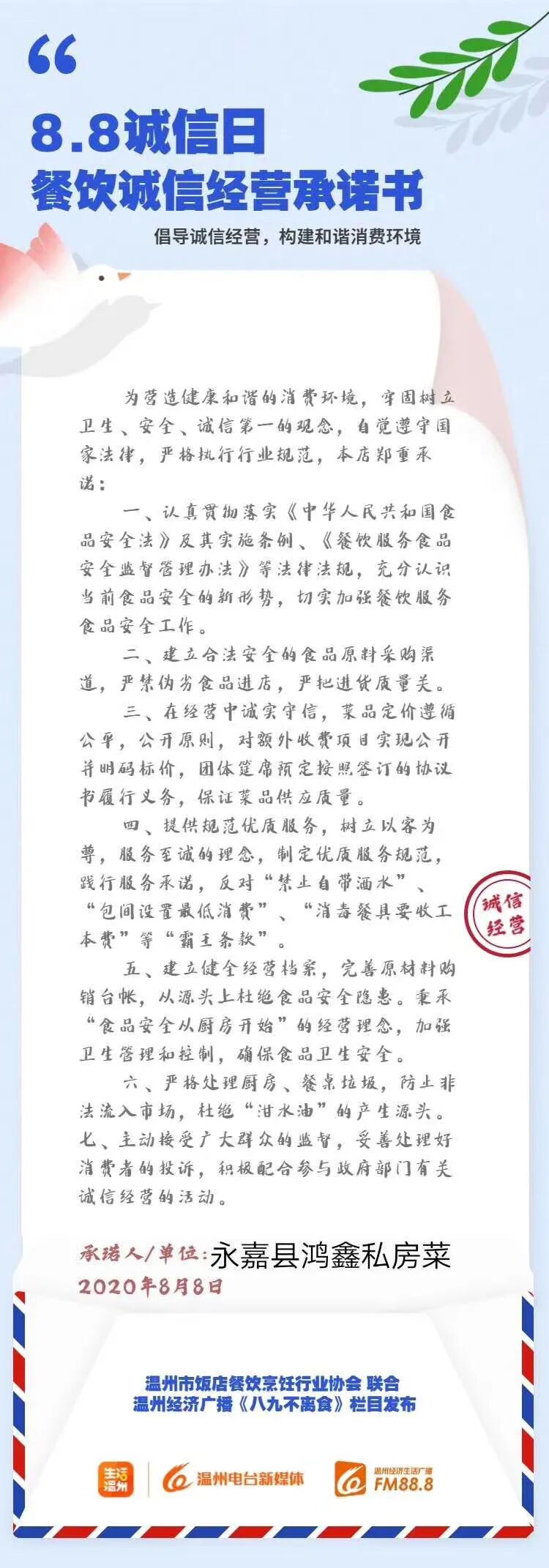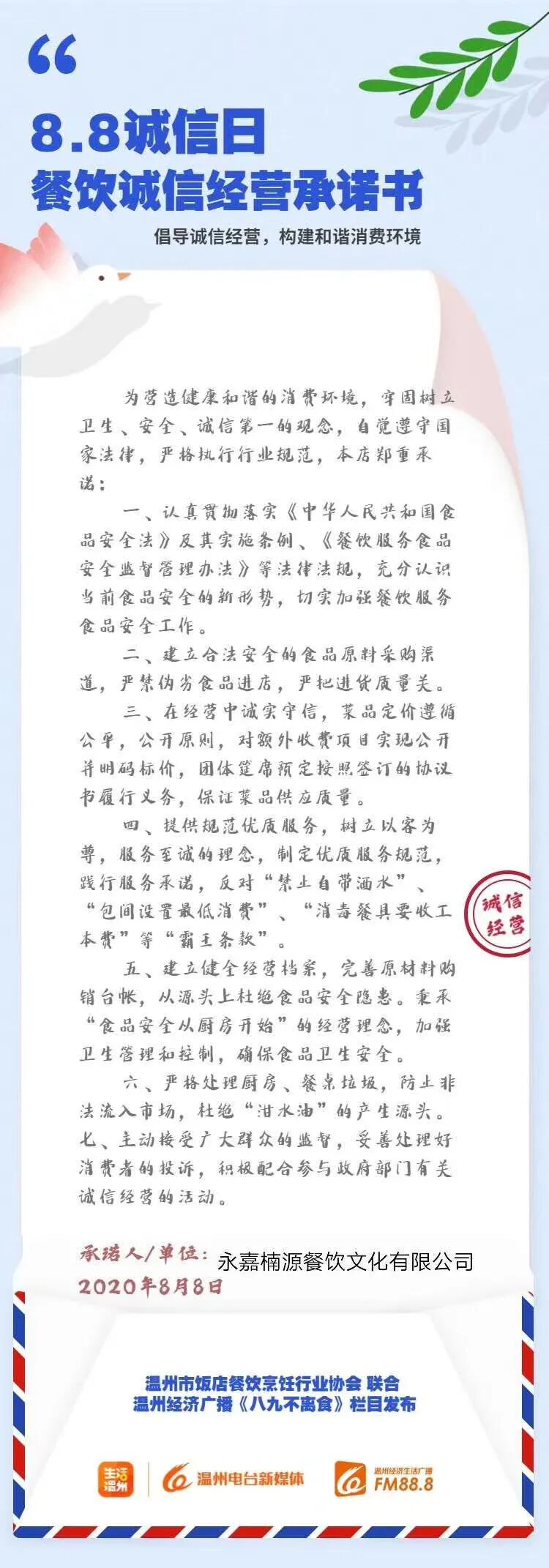 "8.8诚信日“,温州市饭店餐饮烹饪行业协会 温州市经济广播电台FM88.8《八九不离食》栏目联合全市餐饮人诚信经营承诺联盟云发布,第一站,直播倡议承诺书,分享诚信经营诚意服务故事和事例!