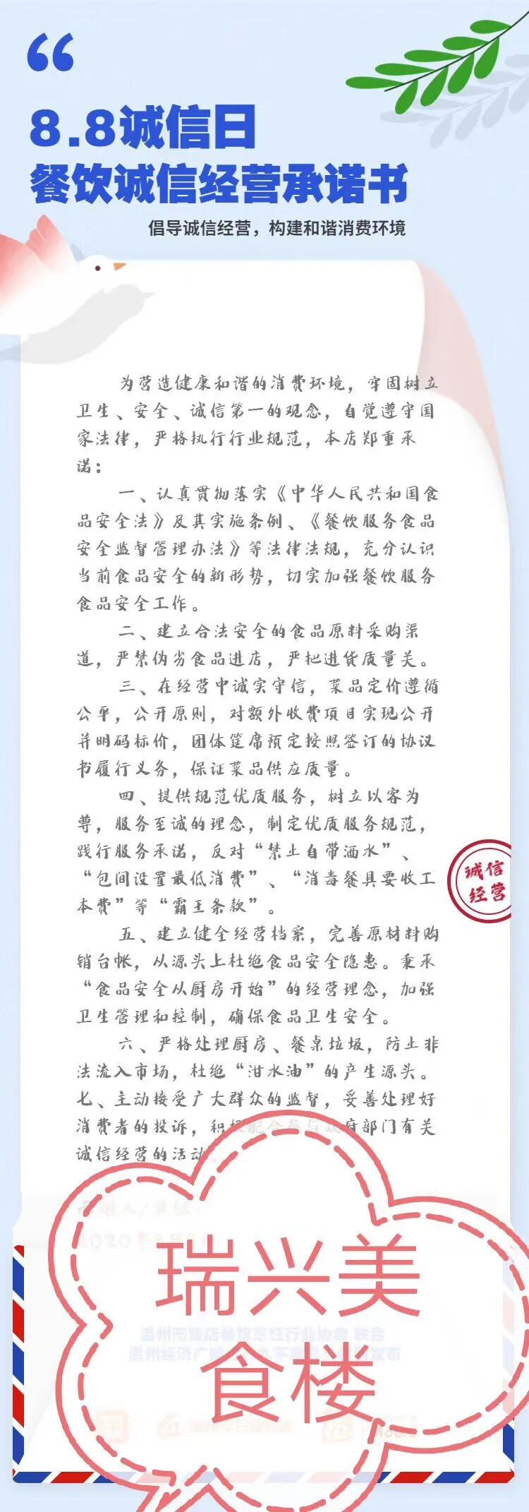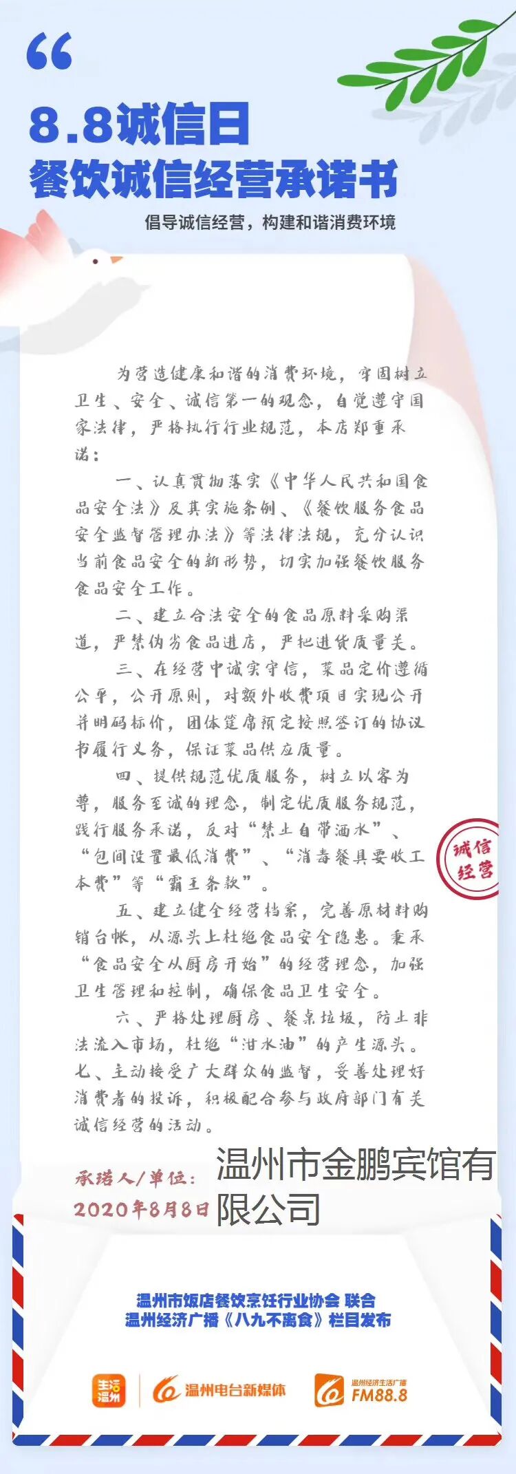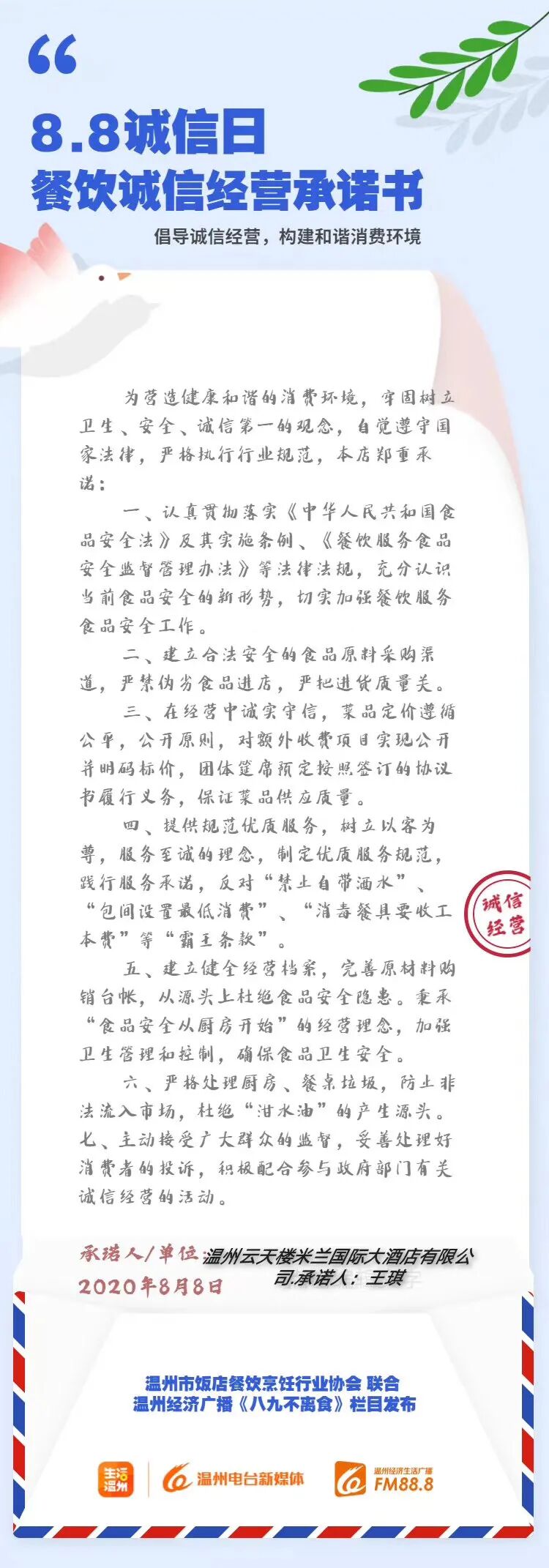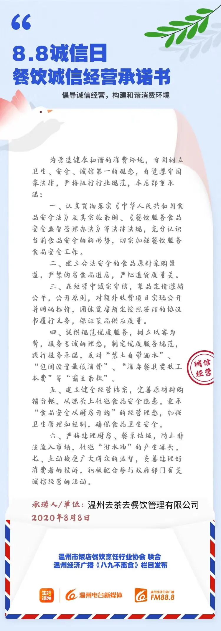 "8.8诚信日“,温州市饭店餐饮烹饪行业协会 温州市经济广播电台FM88.8《八九不离食》栏目联合全市餐饮人诚信经营承诺联盟云发布,第一站,直播倡议承诺书,分享诚信经营诚意服务故事和事例!