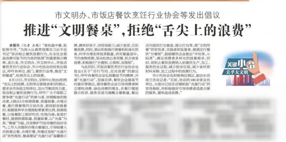 我们在行动 协会积极响应“光盘行动” 8月份以来开展多次宣传活动。 “厉行节约 反对浪费”倡议书 成立反对餐饮浪费联盟,已有超过百家企业加入 举行“倡导文明用餐 抵制餐饮浪费”主题宣传活动 推送多条“光盘行动”宣传公众号推文 协会会员企业推出形式多样的“光盘行动”鼓励措施 “光盘行动”活动剪影