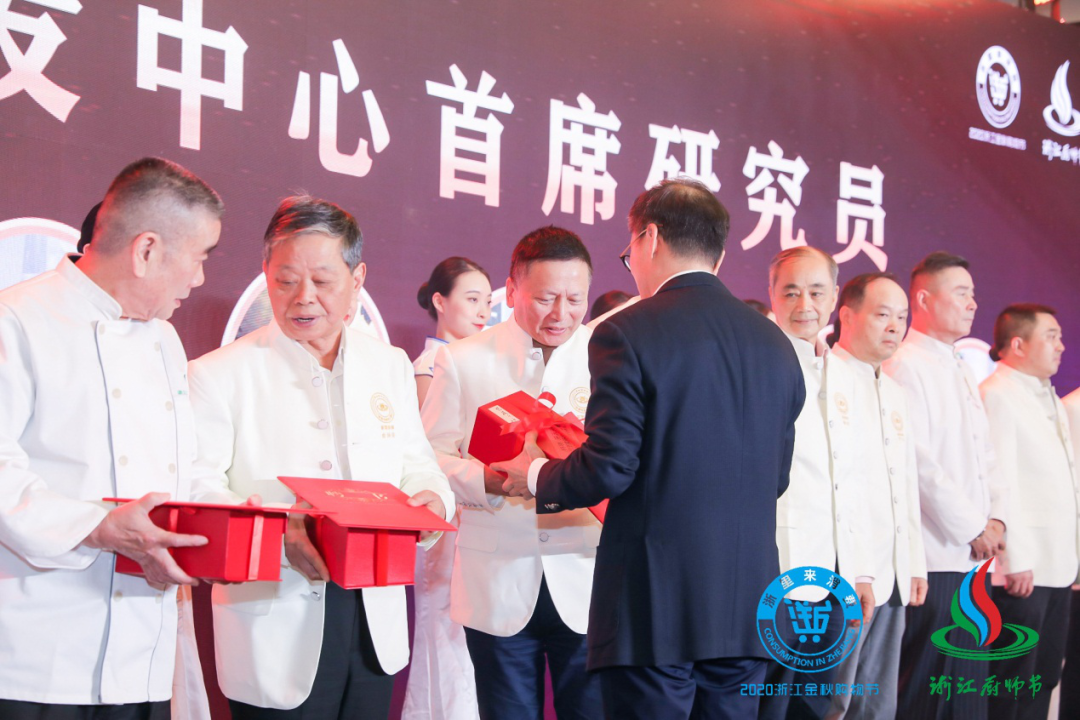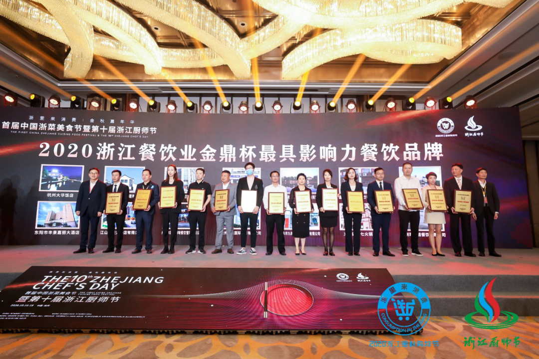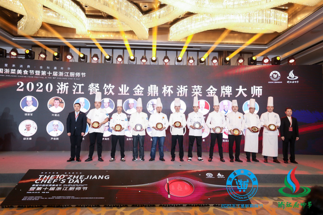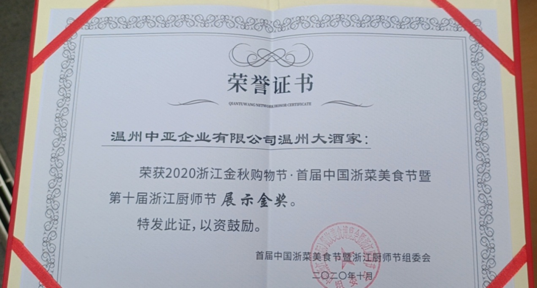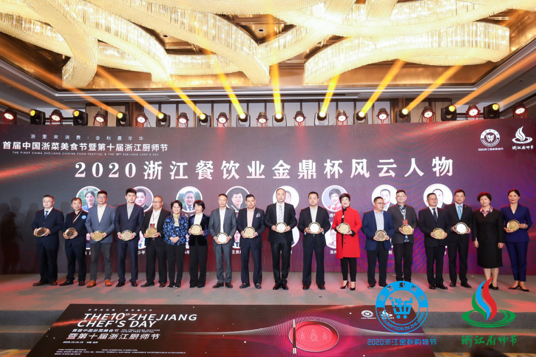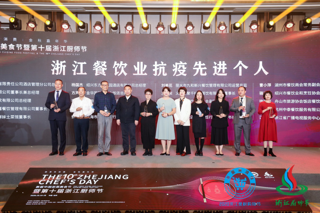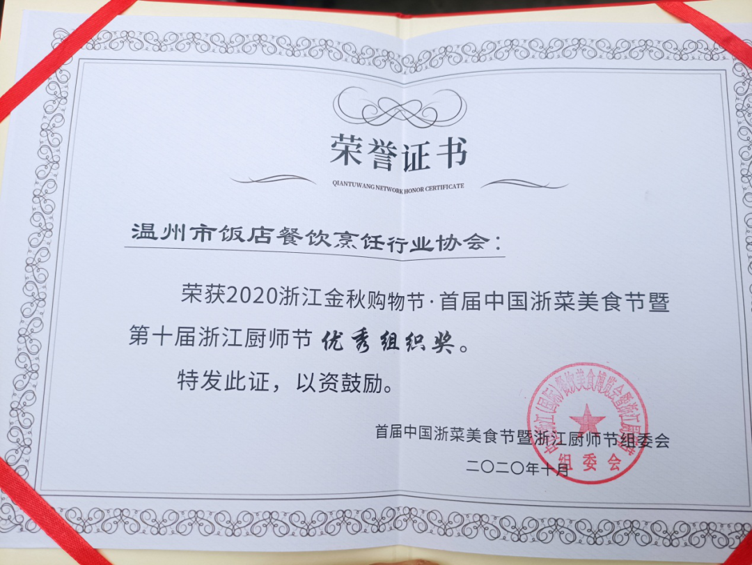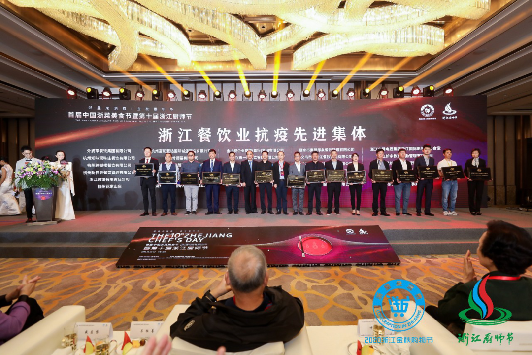 温州去茶去餐饮管理有限公司荣获浙江餐饮业抗疫先进集体 吴 洁-温州市饭店餐饮烹饪行业协会秘书长 荣获浙江餐饮业抗疫先进个人 陈健忠-温州市珍宝舫大酒店有限公司行政总厨 命名为:浙江餐饮业金鼎杯浙菜金牌大师 杨文记-温州去茶去餐饮管理有限公司工会主席 命名为:2020浙江餐饮业金鼎被金牌服务大师 傅银媚-浙江葡萄园大酒店餐饮有限公司总经理 命名为:2020浙江餐饮业金鼎杯风云人物 温州市天天餐饮管理服务有限公司命名为:浙江餐饮业金鼎杯最具影响力品牌企业 此外,十大浙菜宗师胡忠英、叶杭胜、俞炳荣、潘晓林、徐步荣、戴永明、茅天尧、李林生 、章乃华、姚国兴被聘为“中国浙菜研发中心首席研究员”。胡坚、黄亚洲、郁建兴、王冬龄、何水法、俞柏鸿被聘为“浙江省餐饮行业协会文化艺术顾问”。 开幕式主会场,瓯菜展台以温州的婚宴和年夜饭为主题,展示了浓郁的温州风俗餐饮文化,吸引了众参会代表的目光,并得到省餐饮协会沈坚会长和吕祖善原省长的高度评价与肯定。 开幕式上来自浙江餐饮界的大咖、巨头、精英、大师汇聚一堂,打造了一场交流、分享、合作、共赢的餐饮盛会! 2020浙江金秋购物节·首届浙菜美食节暨第十届浙江厨师节,温州大酒家荣获了展示金奖,温州市饭店餐饮烹饪行业协会荣获了优秀组织奖等多项殊荣。