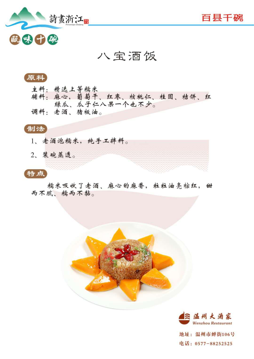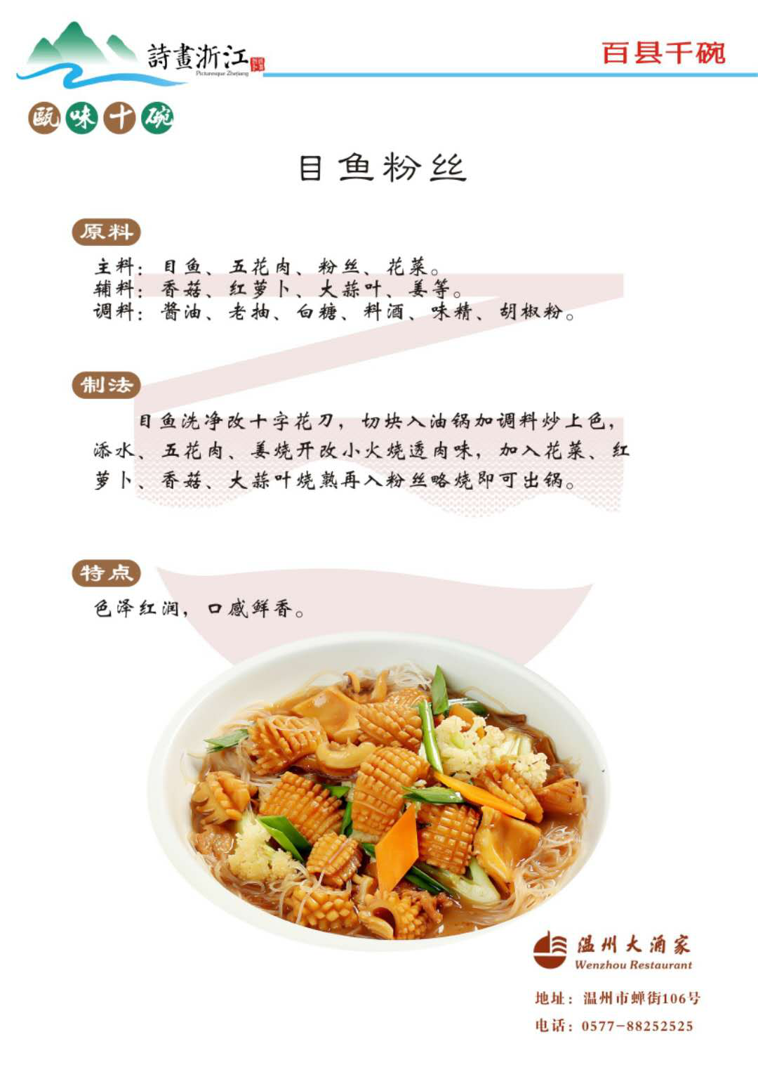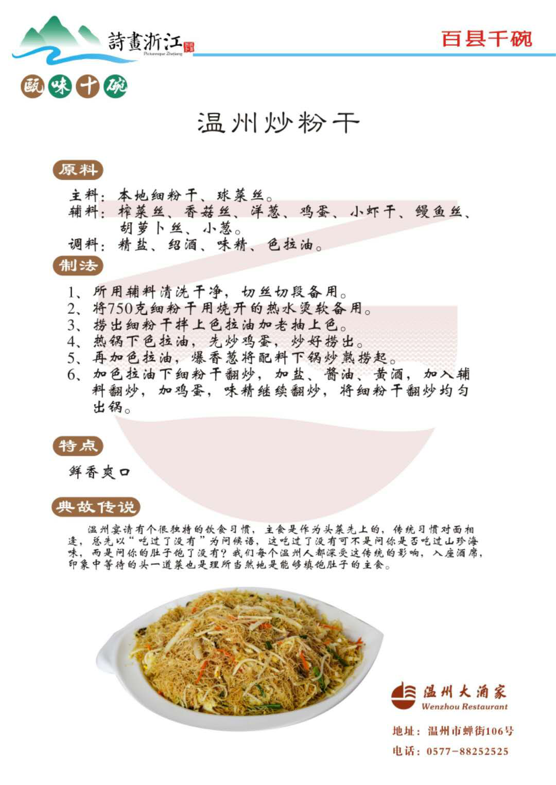 展览期间,由温州市文化广电旅游局主办,温州市饭店餐饮烹饪行业协会和温州大酒家联合承办布展的诗画浙江·百县千碗瓯味十碗展台前人头攒动,杭州市民和来自全国各地的游客纷纷将温州的“十全十美”菜品拍照收藏,并详细了解温州特色美食。一位60年未回温州家乡的大娘在展位前注视菜品良久不愿离开。在杭州湖滨步行街百县千碗展区,长达6米的温州瓯味十碗展台上,装扮布展结合了温州“瓯”文化系列的瓯绣、瓯窑、瓯酒、瓯礼等元素,重点展示十冷盘加上十热菜,寓意“十全十美”,充分体现了温州菜品注重寓意饮食文化,也是最接温州地气最具温州记忆的“瓯味十碗”。十个红艳艳的高脚碗,由十个绿衣娃娃抱着,一端上来就显出“家宴”的气势和精致,每个菜有寓意又讲究,还表达了美好祝愿——“红红火火,步步高升”。每道菜都是正宗的温州老味道,菜上要放一片红萝卜,方言称“红菜”,意为讨个好彩头。鱼饼,讲究内白外黄的色泽,寓意黄金白玉。鳗鲞,温州话“鲞”读音同“想”,意为“聪明上进”。鱼胶冻,颜色几乎透明,象征“做人要清清白白”。小段厚肥膘挂糊后炸至外皮酥脆,再用融化后的白糖挂霜的炸羊尾寓意“吉祥如意”。鸡蛋、咸鸭蛋、皮蛋组成的三色蛋代表“三色祥云”。此外,酱油肉寓意“红红火火”;酱油鸡寓意“闻鸡起舞”;花蛤寓意“财路多多”;江蟹生寓意“美满和谐”;橘子寓意“大吉大利”。温州百县千碗活动精挑细选的十盘热菜盘盘有说法。温州上菜顺序更是讲究。主食是第一个上的,先上主食,垫垫肚子再喝酒,说明温州人非常注重养生,饮食习惯很科学。温州炒粉干,可以说来过温州的游客,都品尝过这道主食;